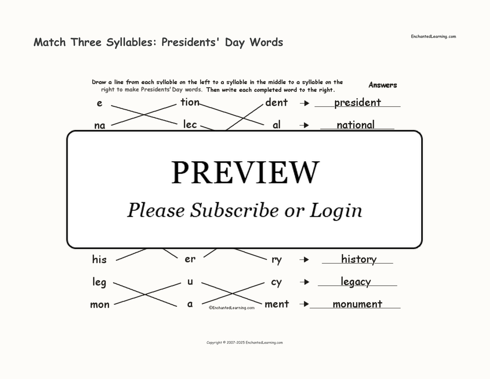On this Match Three Syllables worksheet, make Presidents' Day words by drawing lines between syllables.