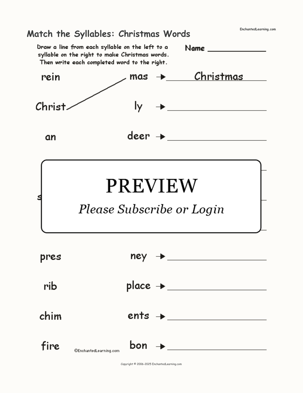 In this printable worksheet, make Christmas words by drawing a line from each syllable on the left to a matching syllable on the right.