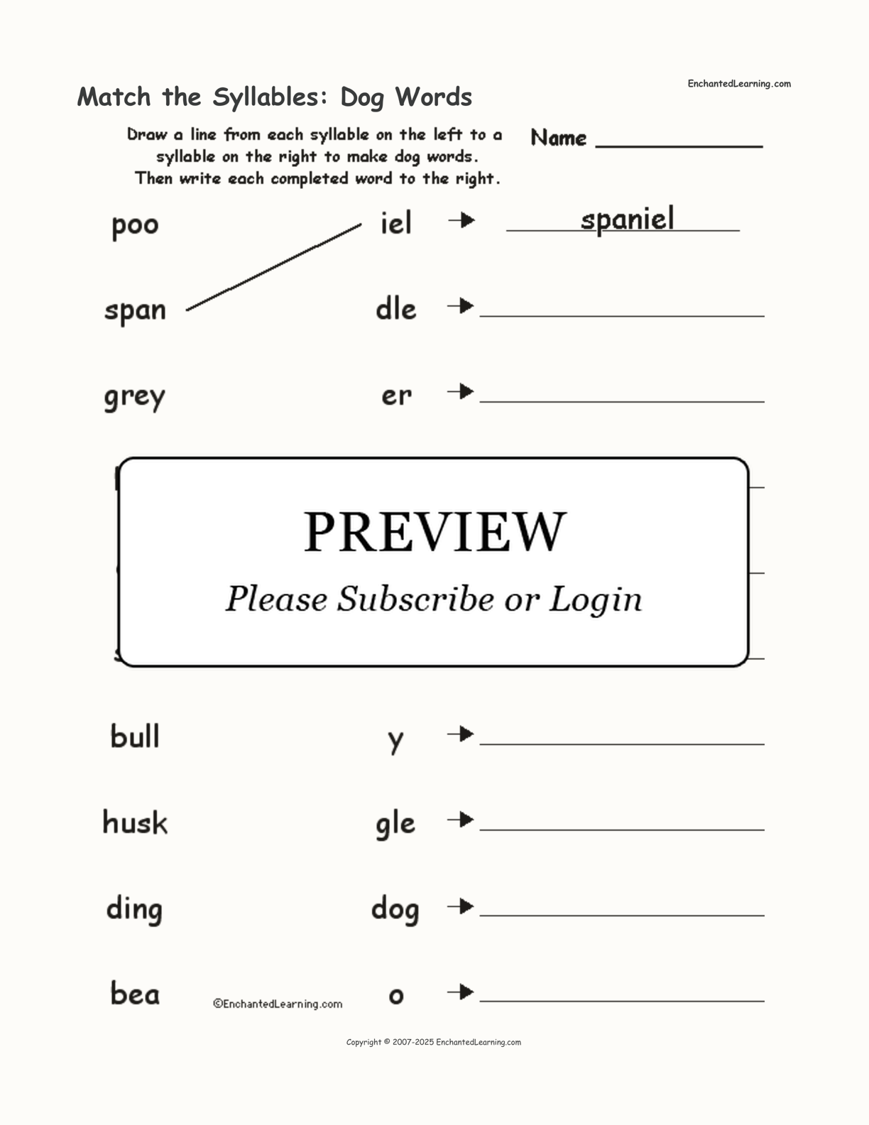 Match two syllables to make ten dog-related words in this printable worksheet.