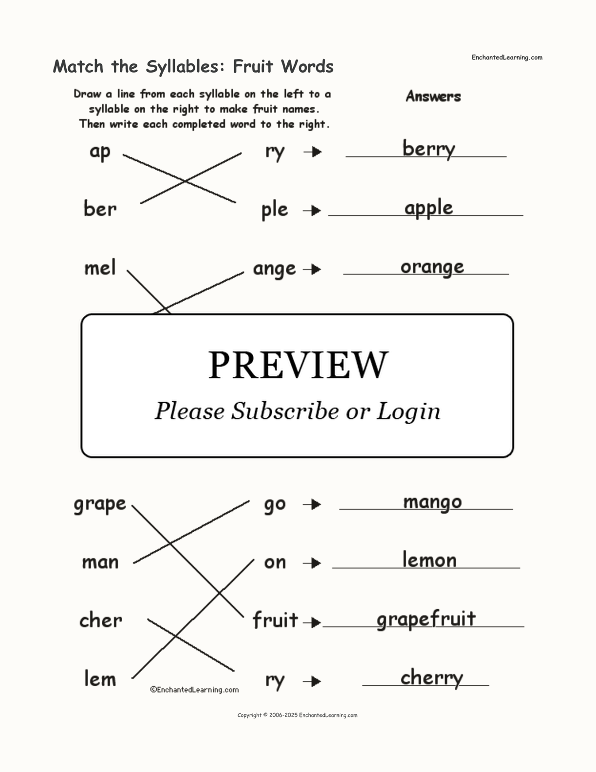 Match two syllables to make ten fruit words in this printable worksheet.