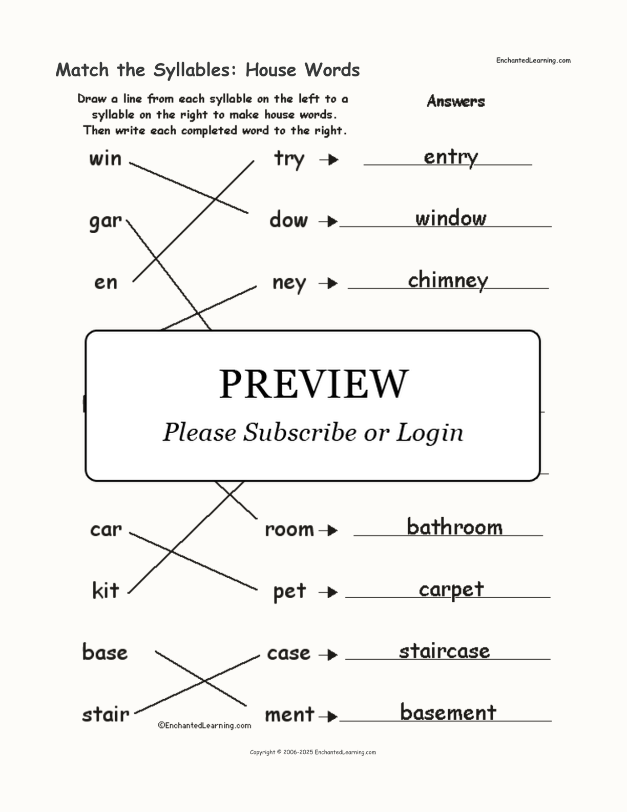 The words are: entry, window, chimney, ceiling, garage, kitchen, carpet, staircase, and basement.