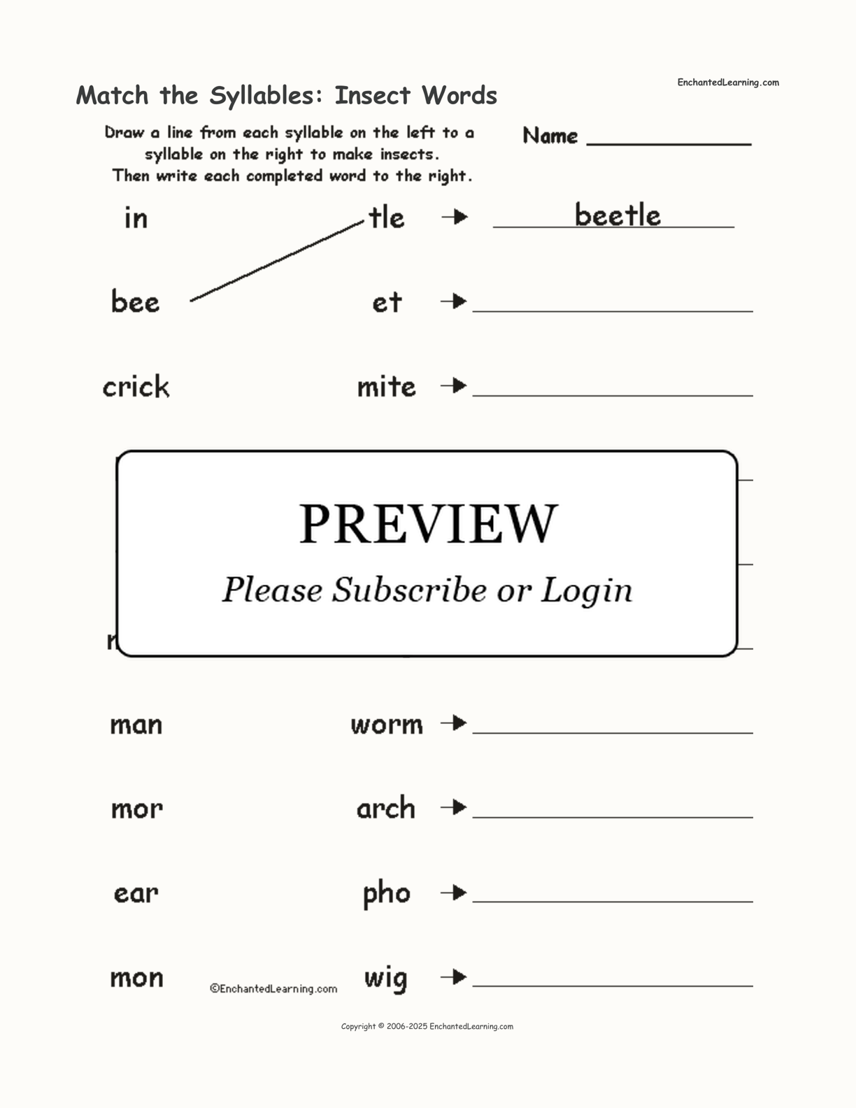 The words are: beetle, cricket, termite, insect, mantid, lacewing, mealworm, monarch, morpho, and earwig.