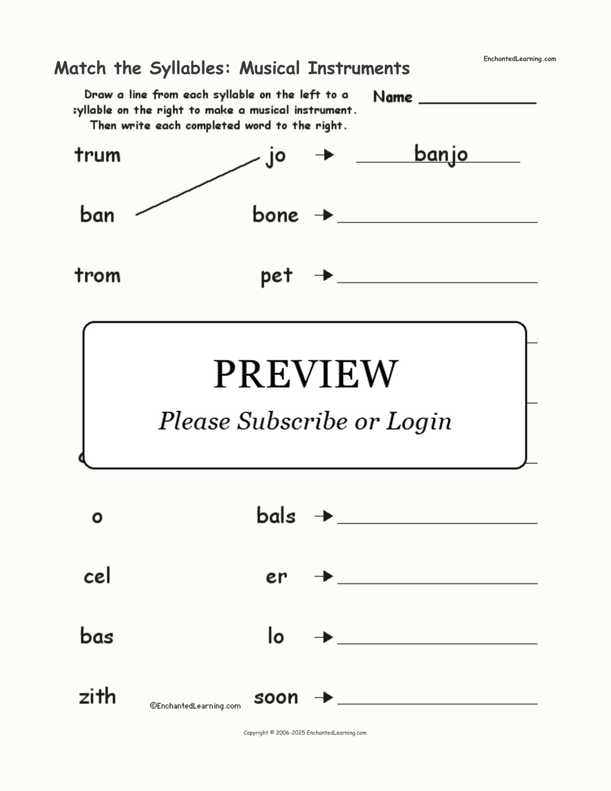 Match two syllables to make 10 musical instruments words in this printable worksheet.