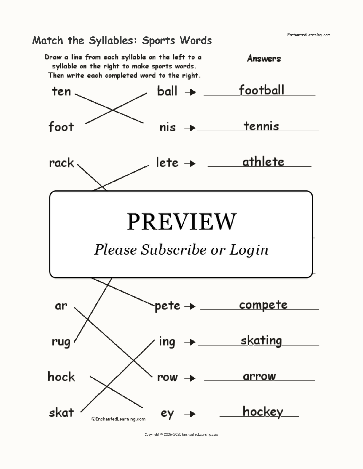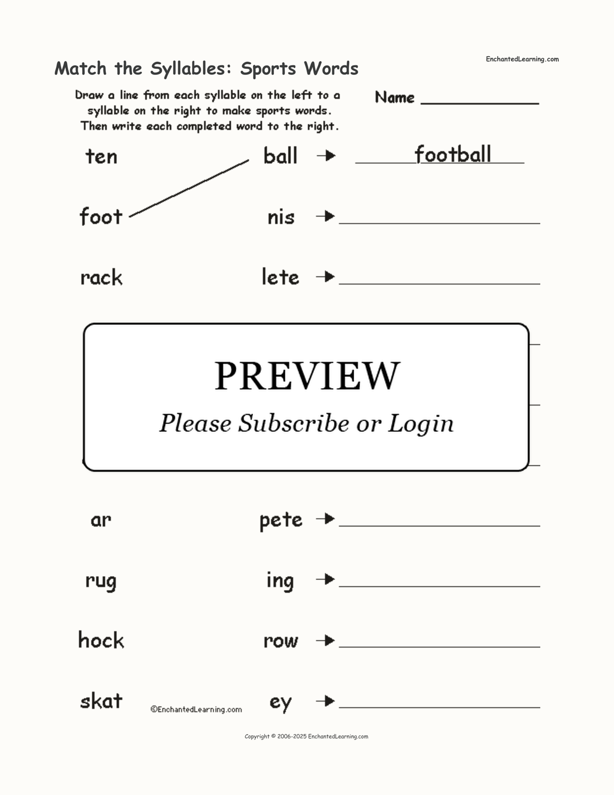 The words are: football, tennis, athlete, rugby, racket, soccer, compete, skating, arrow, and hockey.