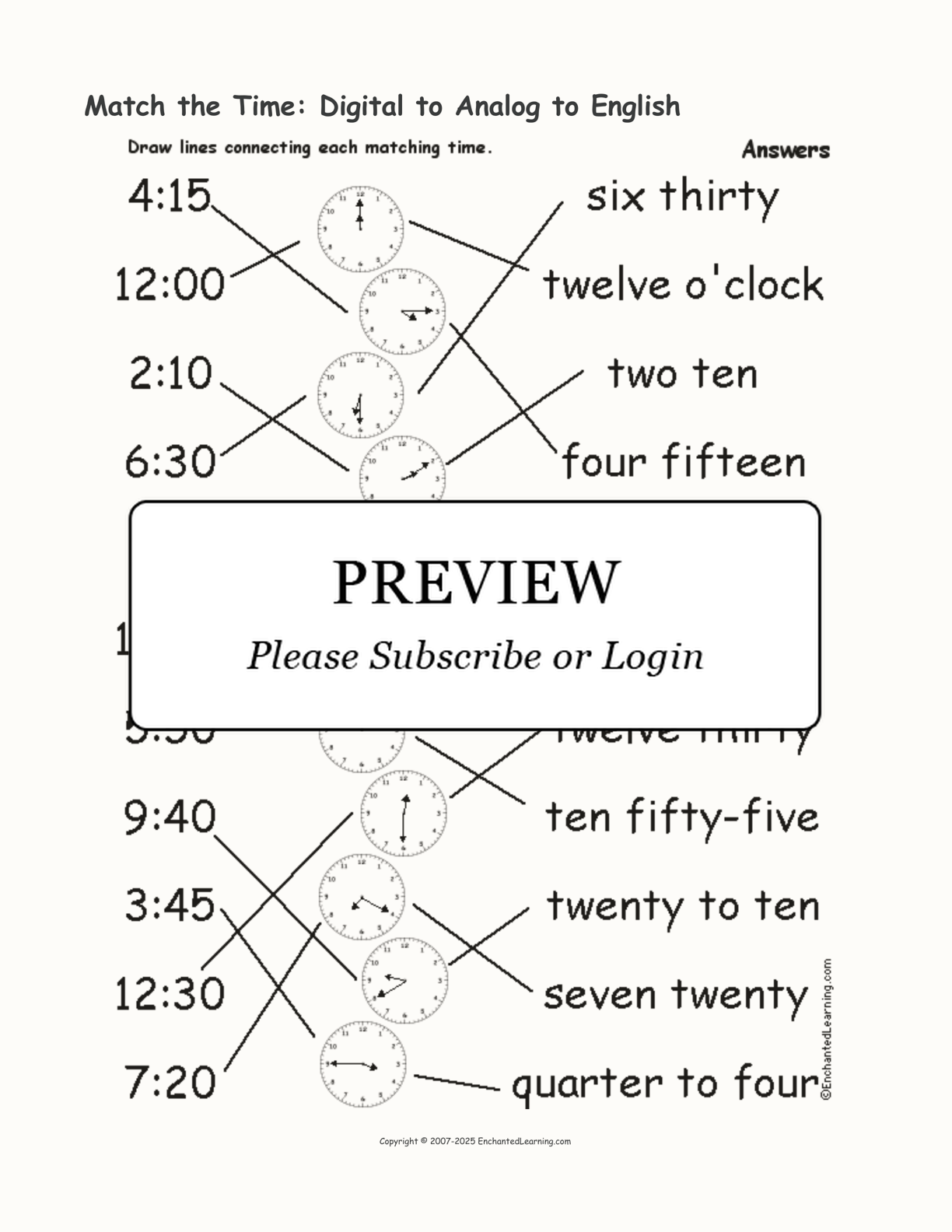 Draw lines between the time expressed in analog, digital, and English. For example, match 4:15 to an analog clock picturing that time, to “four fifteen.”