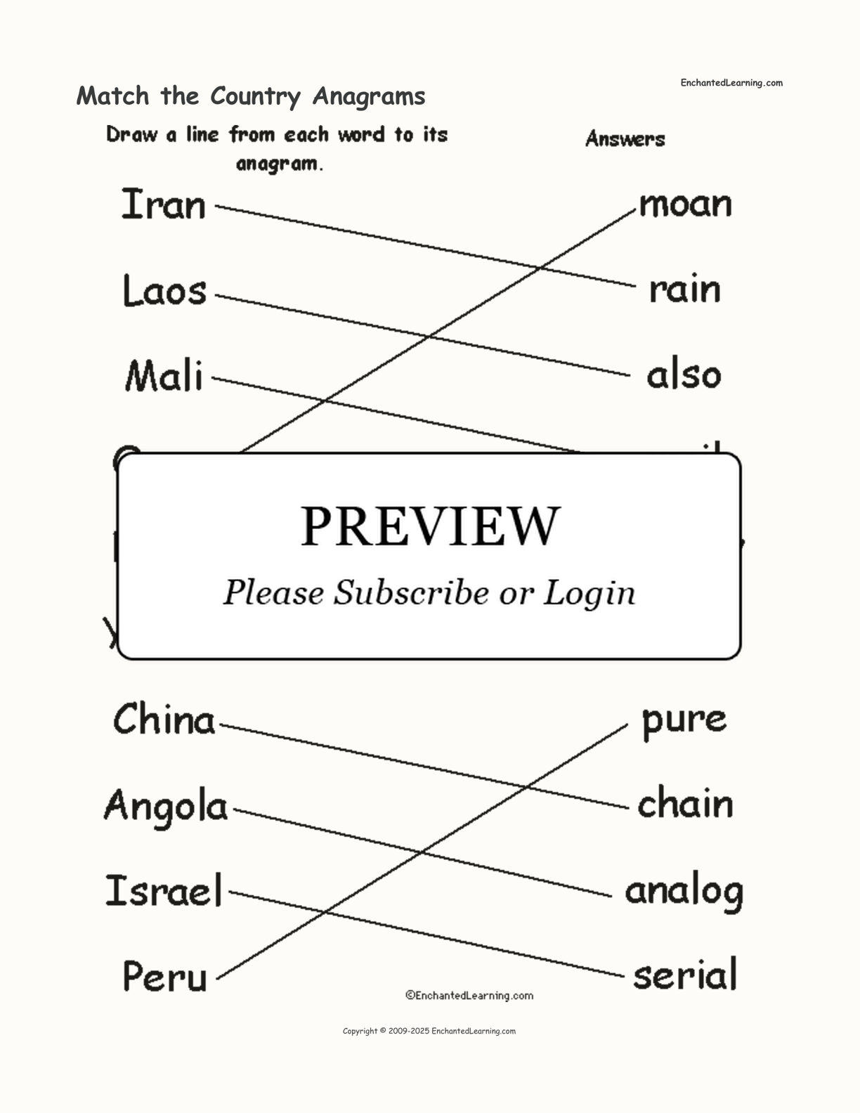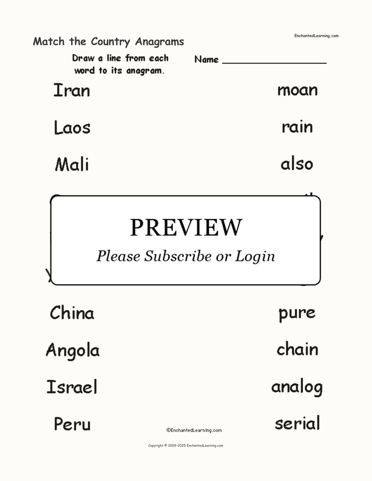 Draw a line from each country name to its anagram in this printable worksheet. Words: Iran/rain, Laos/also, Mali/mail, Oman/moan, Niger/reign, Yemen/enemy, China/chain, Angola/analog, Israel/serial, and Peru/pure.