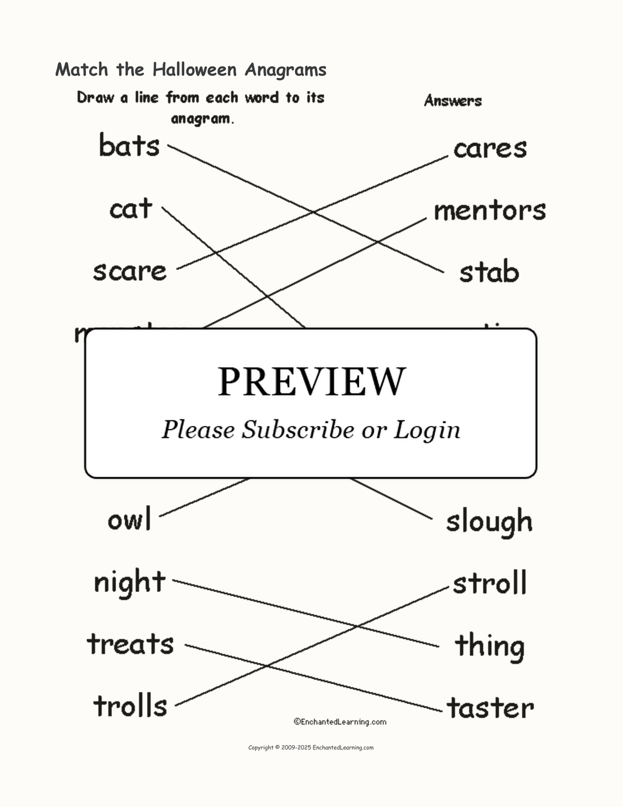 Match the Halloween anagrams in this printable worksheet. Draw a line from each word to its anagram (another word which is a rearrangement of the first word’s letters).