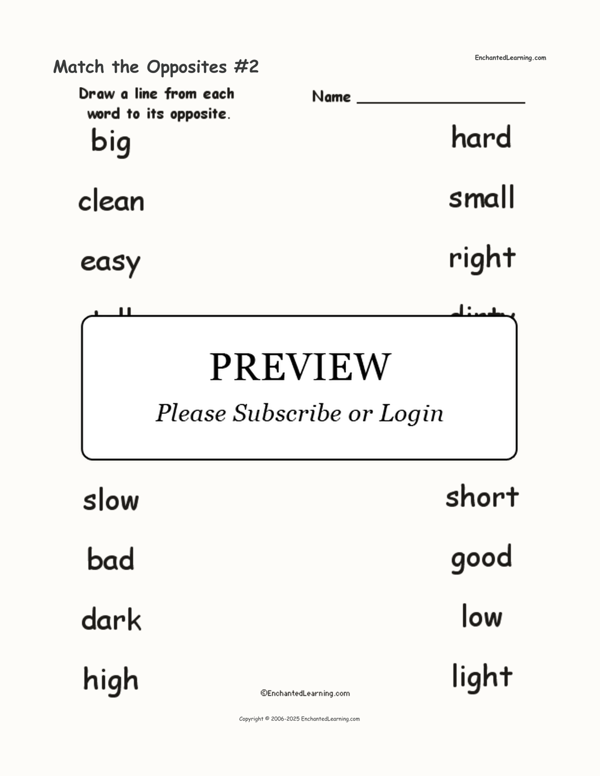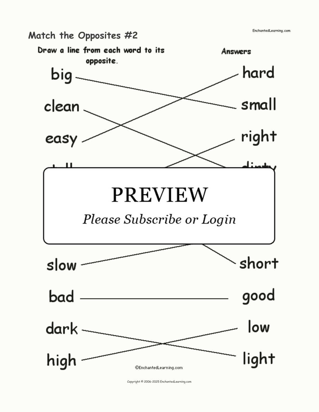 Match 10 words to their opposites in this printable worksheet. The words are: big/small, clean/dirty, easy/hard, tall/short, left/right, rich/poor, slow/fast, bad/good, dark/light, and high/low.