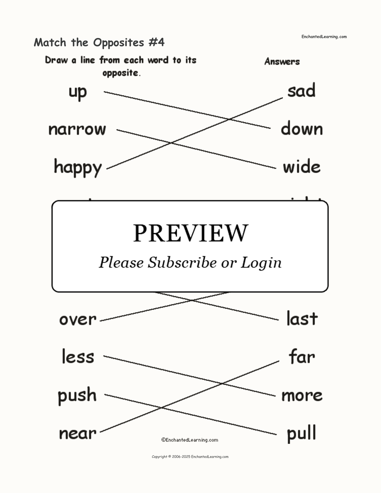 Match 10 words to their opposites in this printable worksheet. The words are: up/down, narrow/wide, happy/sad, empty/full, day/night, first/last, over/under, less/more, push/pull, and near/far.