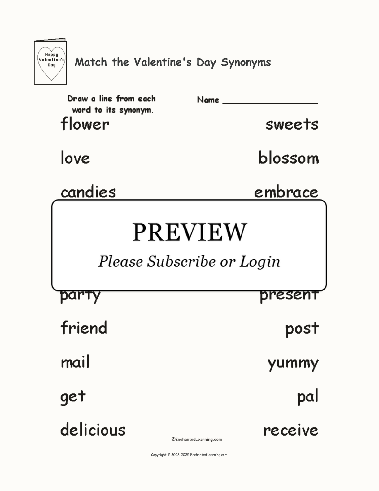 Draw a line from each Valentine’s Day word to its synonym. This printable worksheet about matching and synonyms is for young students.