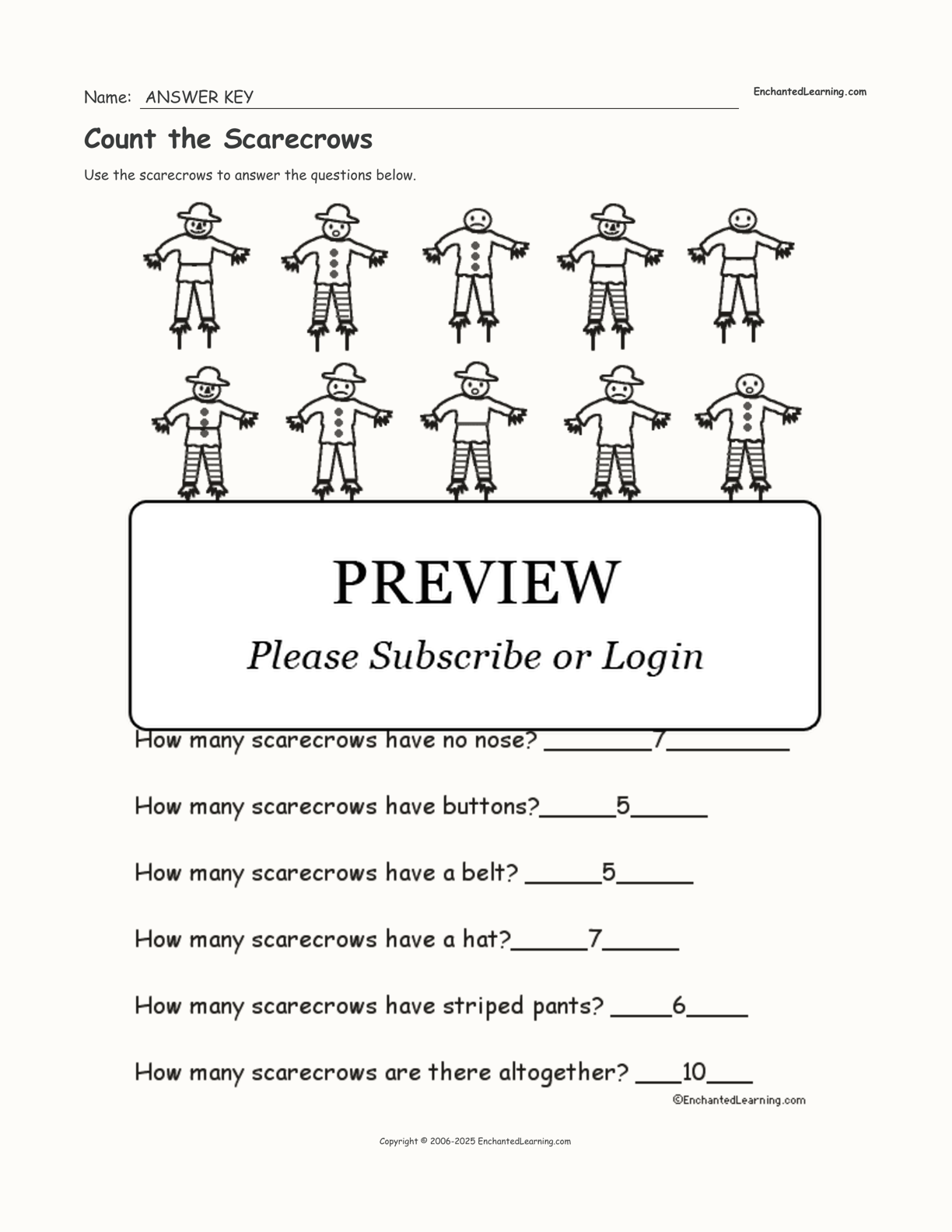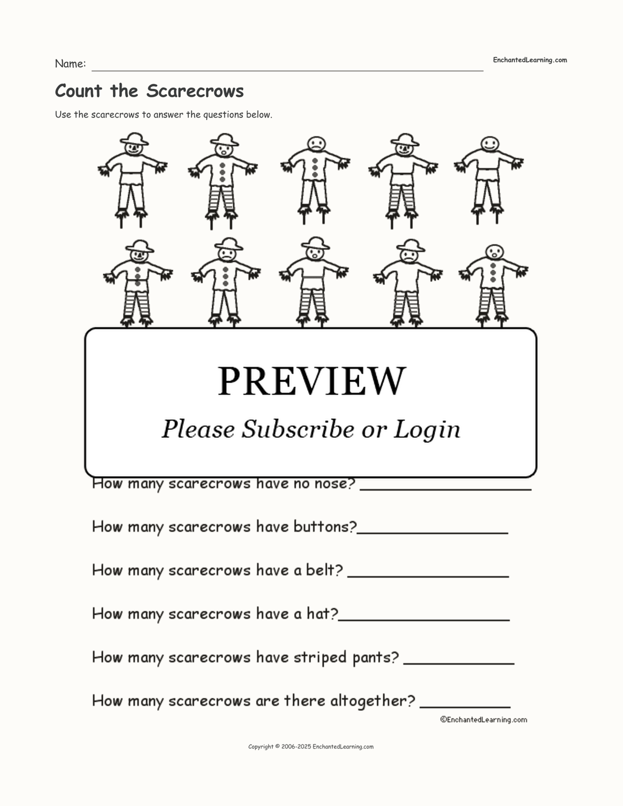 In this printable worksheet, count the scarecrows that are smiling, frowning, surprised, wearing a hat, etc.