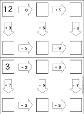 This is a thumbnail of the "Follow-the-Arrows Addition and Subtraction Puzzles" page. Do addition and subtraction problems along the paths according to the arrows until you get to the end. You should get to the same final answer three different ways. The full-size printout is available only to site members.