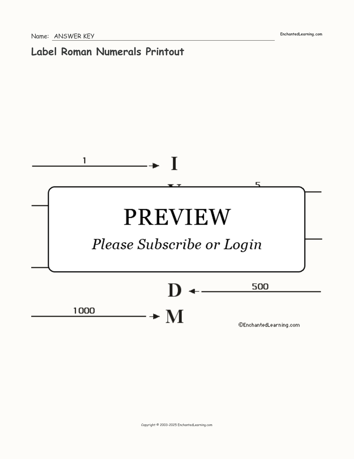 Label the Roman numerals printout, including I (1), V (5), X (10), L (50), C (100), D (500), and M (1,000).