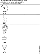 This is a thumbnail of the page: "For each item, draw the coins that you would need to buy it. Use pennies (1¢), nickels (5¢), dimes (10¢) and/or quarters (25¢)." The full-size printout is available only to site members.