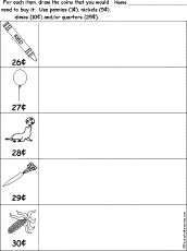 This is a thumbnail of the page: "For each item, draw the coins that you would need to buy it. Use pennies (1¢), nickels (5¢), dimes (10¢) and/or quarters (25¢)."