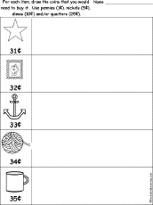 This is a thumbnail of the page: "For each item, draw the coins that you would need to buy it. Use pennies (1¢), nickels (5¢), dimes (10¢) and/or quarters (25¢)." The full-size printout is available only to site members.
