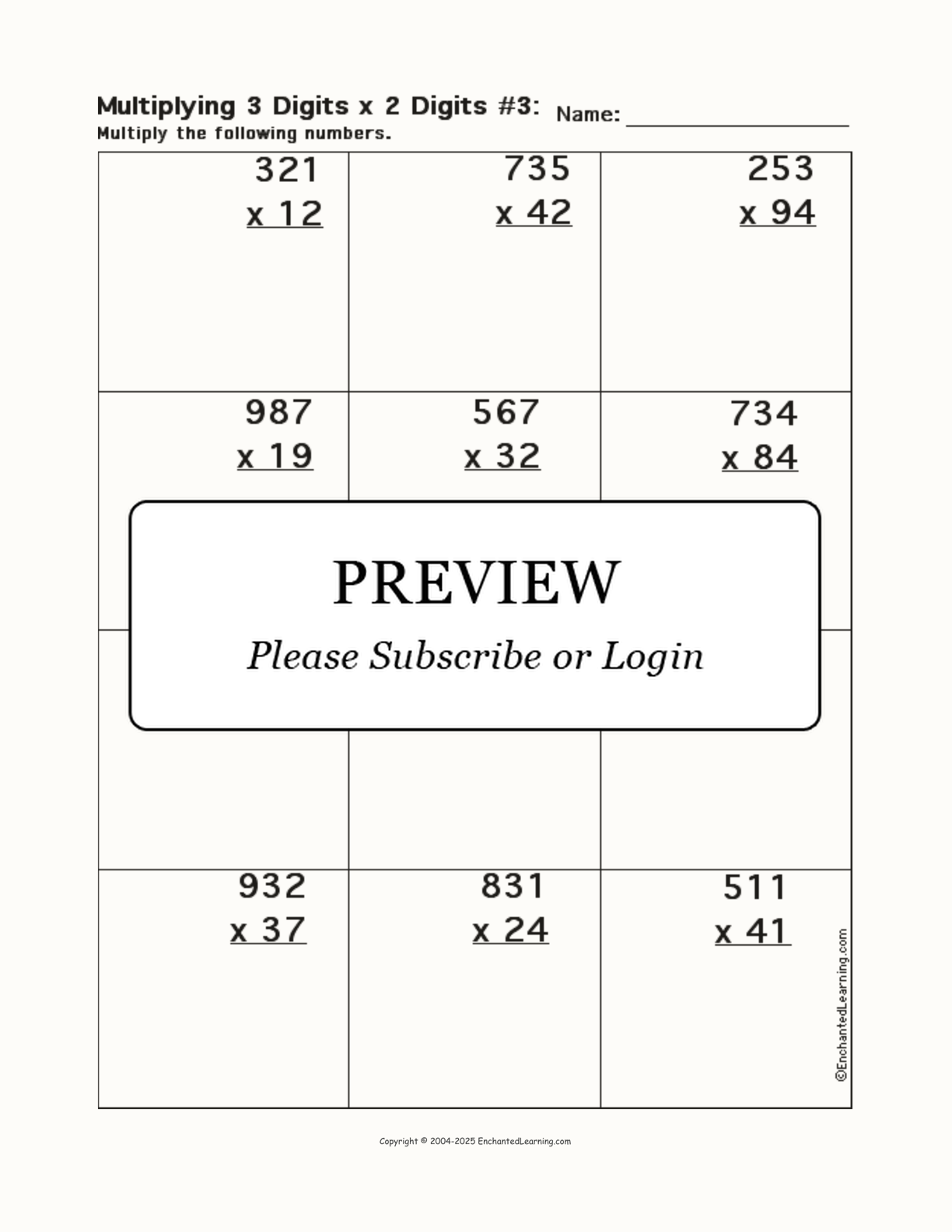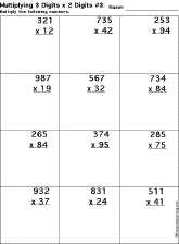Multiply a three-digit number by a two-digit number in this printable worksheet (#3).