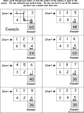 Multiplying Numbers Path-o-Math Puzzles: 2 by 3 Make a path through each number matrix so that the product of the numbers is equal to the given answer. Use only horizontal and vertical trails. You may not have to use all the numbers, and don't use a number more than once. Puzzle #1, or the answers Puzzle #2, or the answers Puzzle #3, or the answers Puzzle #4, or the answers Puzzle #5, or the answers |