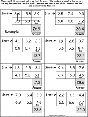 This is a thumbnail of the "Path-o-Math Adding Decimals Puzzle" page. Make a path through each matrix so that the sum of the numbers is equal to the answer. Use only horizontal and vertical trails. You may not have to use all the numbers, and don't use a number more than once. The full-size printout is available only to site members.