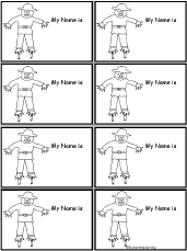 Scarecrow Nametag Printable (Black-and-White) Eight scarecrow nametags in black-and-white on one printable page. |