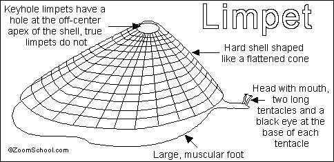 Anatomy: The soft body is divided into the head, the visceral mass, and the foot (which is small). The limpet has a long pair of tentacles on the head; it has a light-sensitive eyespot located on the base of each tentacle. The biggest limpets are up to 4 inches (10 cm) wide, but most are smaller. The limpet's shell is not coiled.