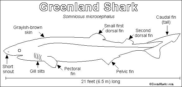 Anatomy: The Greenland shark is up to 21 feet (6.5 m) long. This grayish-brown shark has a short snout and small fins. Bioluminescent (glowing) copepods attach to the Greenland shark's corneas (a part of the eyes). This may attract curious prey to the shark's head! The shark's upper teeth are long and sharp; the lower teeth are flatter, more closely-set (and also sharp).