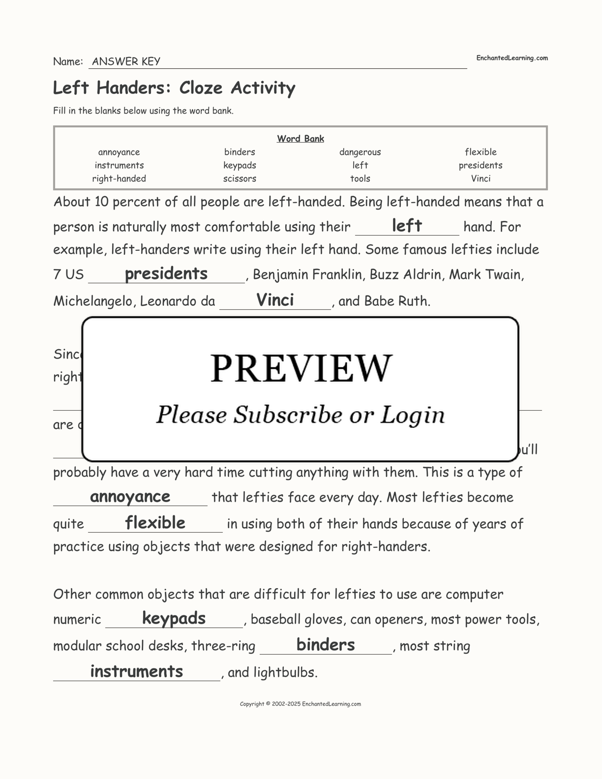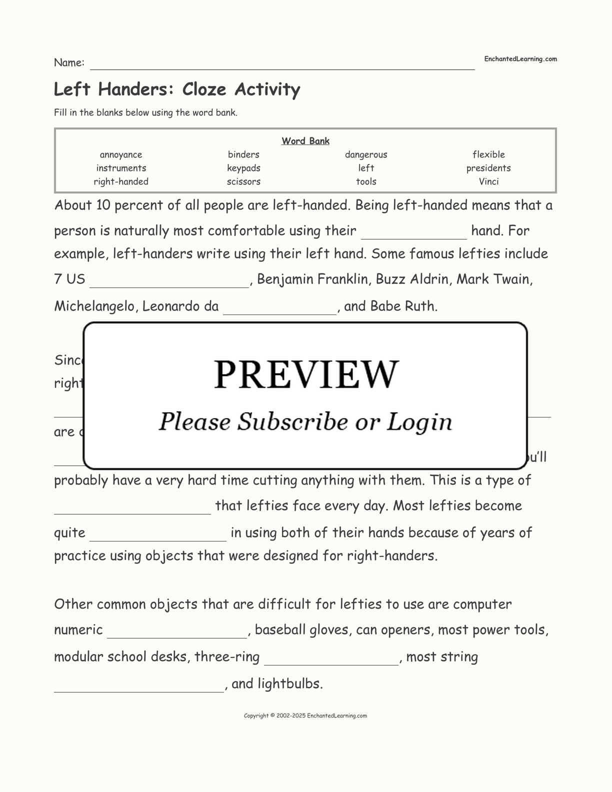Use the word bank to fill in the blanks in this left handers cloze activity. This is a printable worksheet.