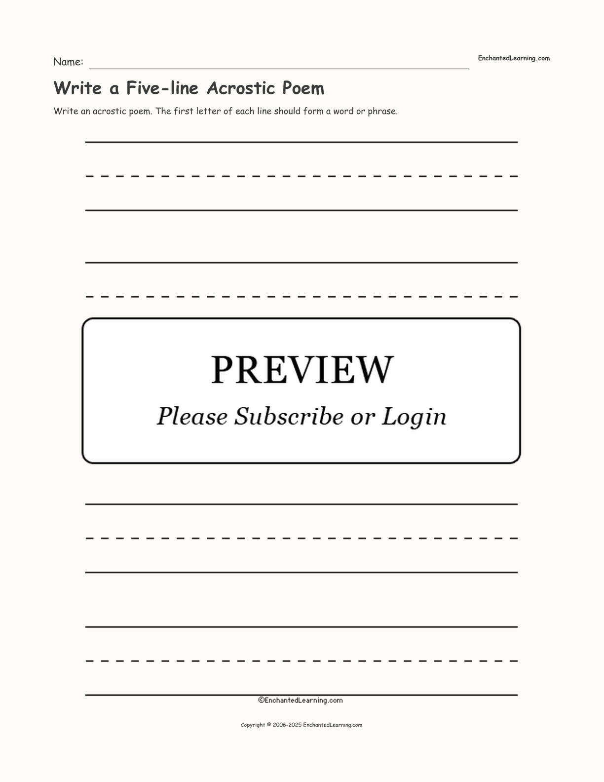 Write an acrostic poem with five lines. The first letter of each line should form a word or phrase.