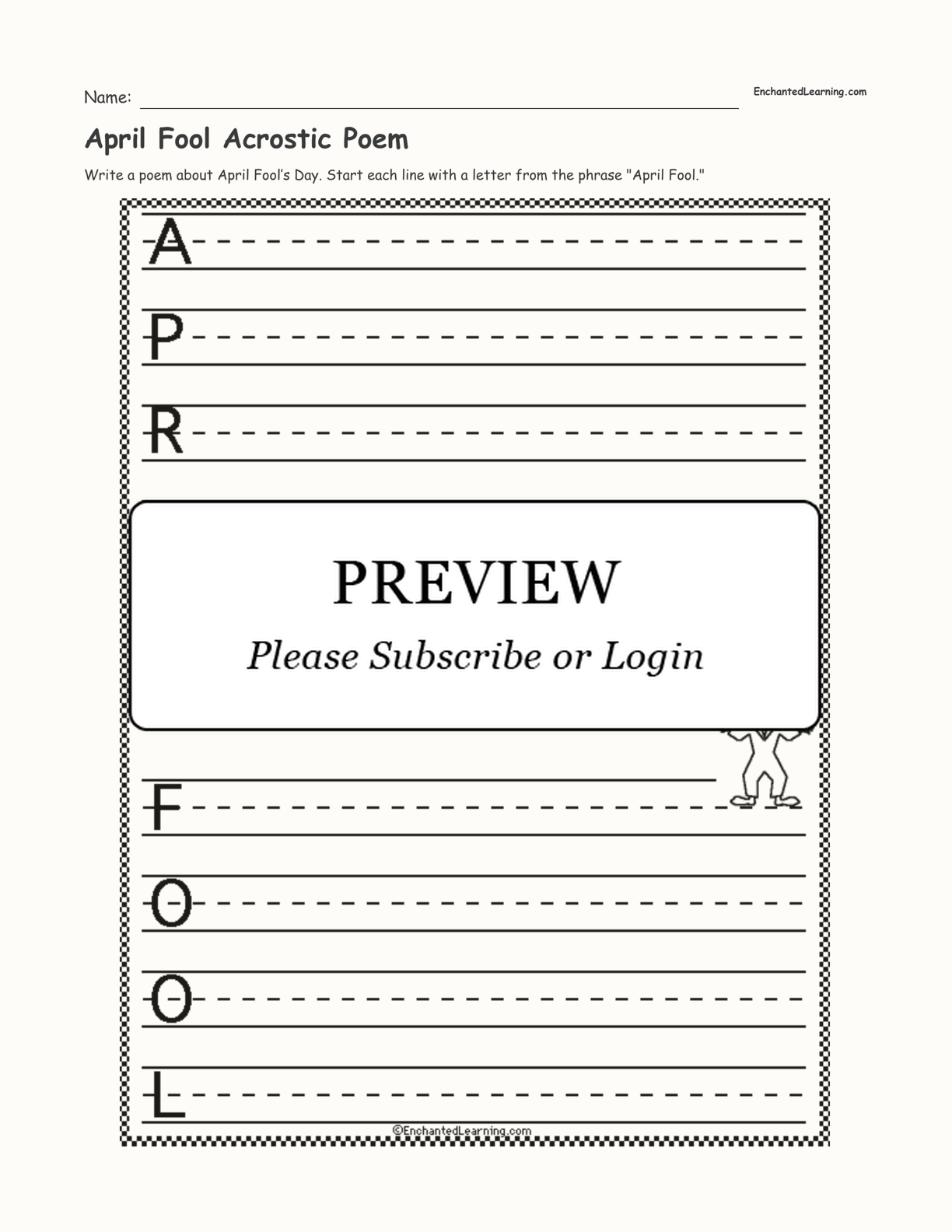 April Fool's Day Acrostic Poem - Write a poem about April Fool's Day. Start each line with a letter from the phrase 'April Fool.'