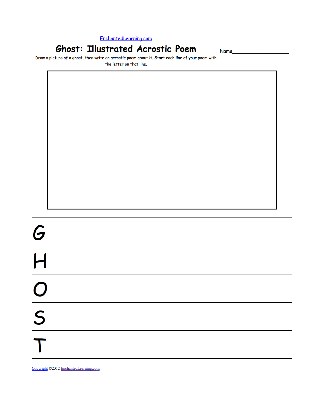 Draw a picture of a ghost, then write an acrostic poem about it. Start each line of your poem with the letter on that line. Or go to a pdf of the poem.
