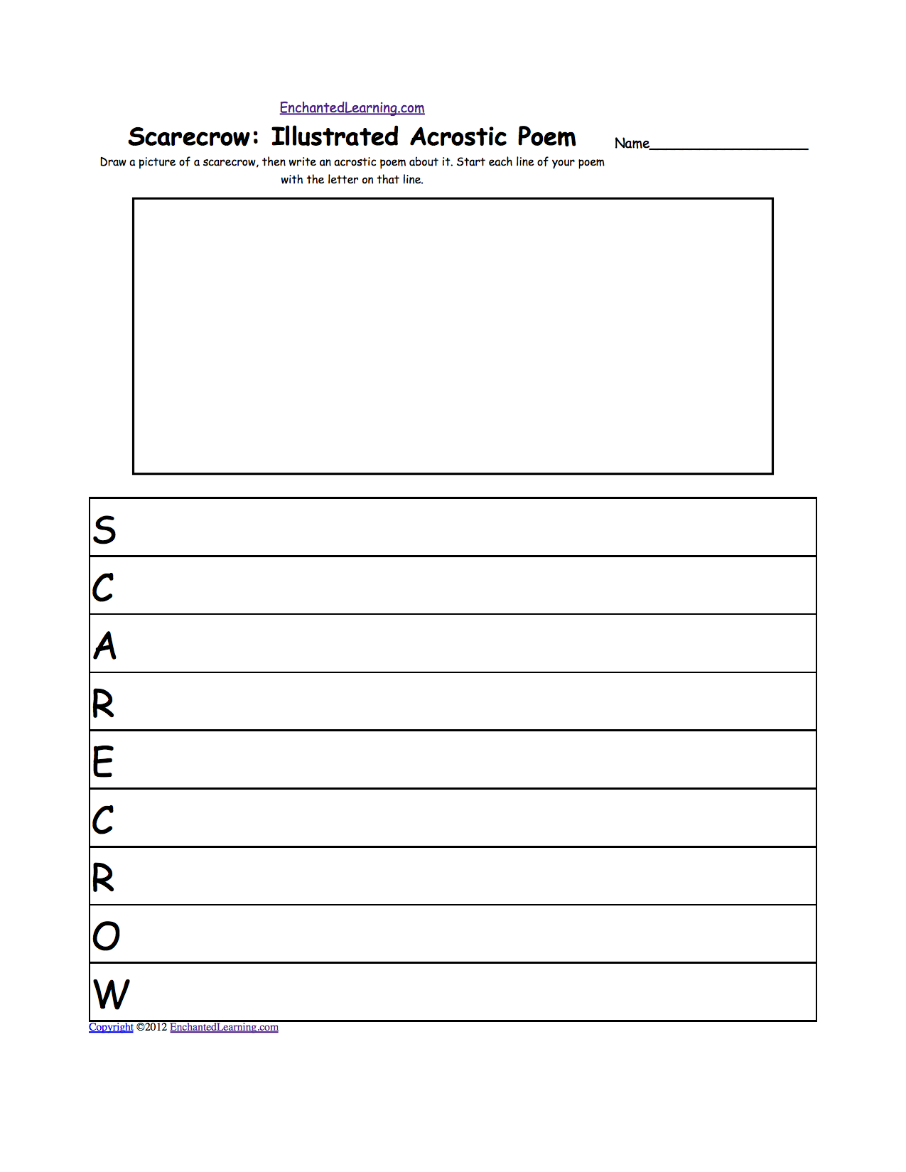 Draw a picture of a scarecrow, then write an acrostic poem about it. Start each line of your poem with the letter on that line. Or go to a pdf of the poem.