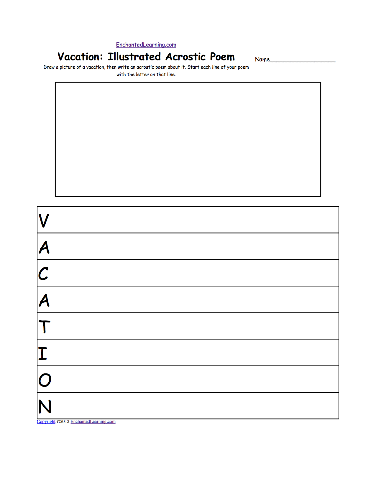Draw a vacation scene, then write an acrostic poem about it. Start each line of your poem with the letter on that line. Or go to a pdf of the poem.