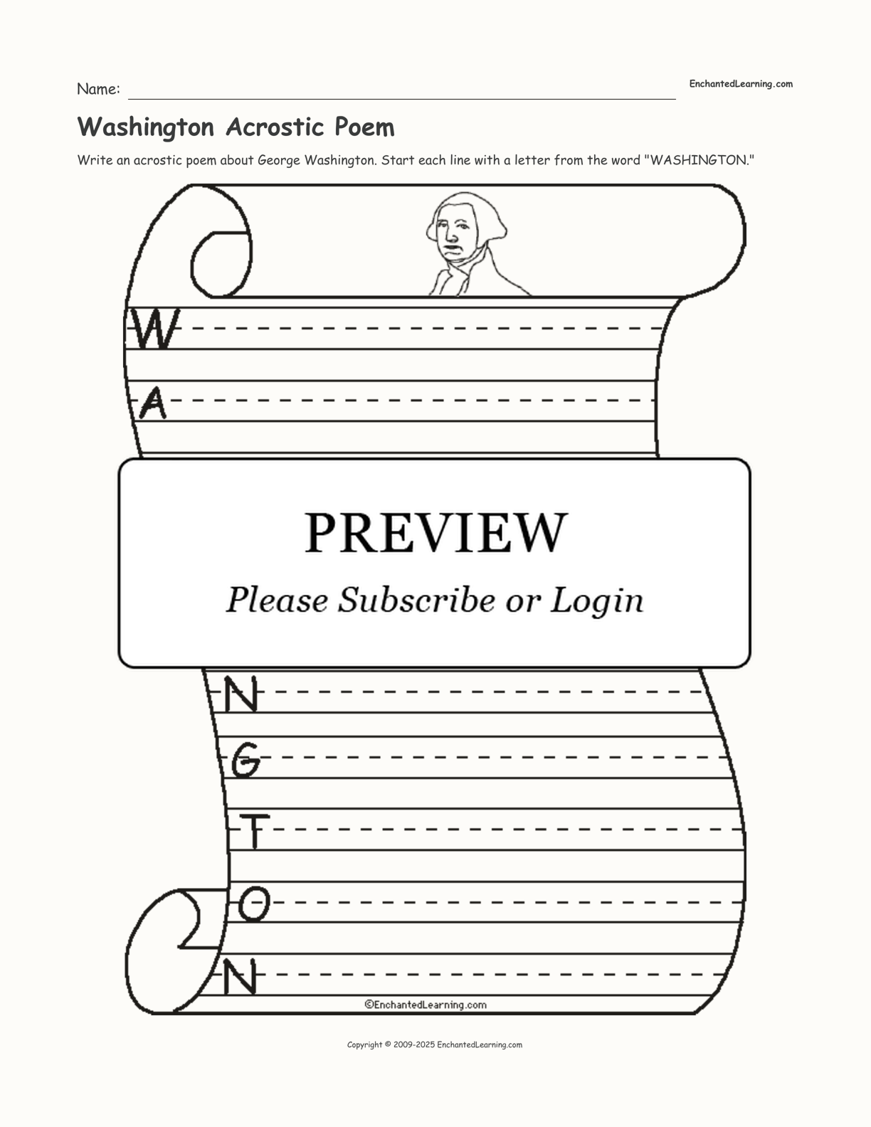 Write an acrostic poem about George Washington on this printable worksheet. Start each line with a letter from the word WASHINGTON.