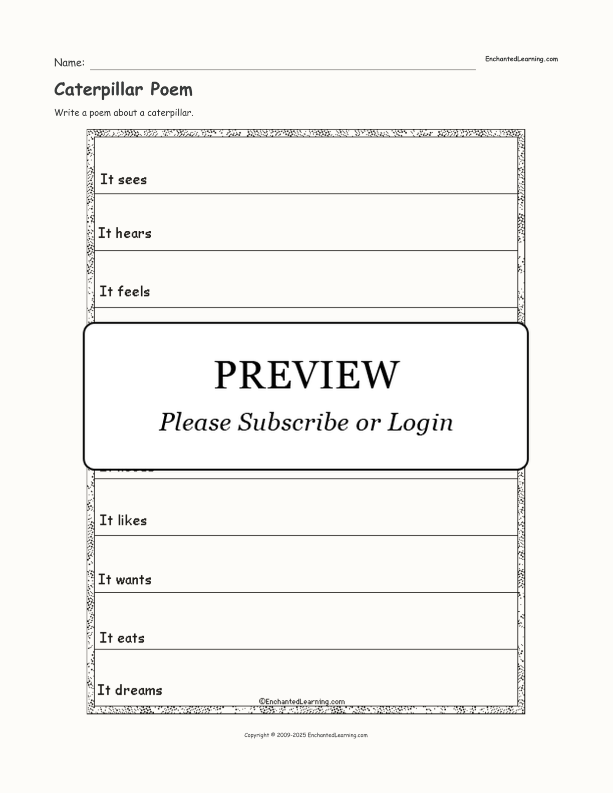 Write a poem about a caterpillar in this printable worksheet. The lines of the poem begin with: It sees, It hears, It feels, It understands, It moves, It needs, It likes, It wants, It eats, and It dreams.