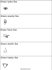 The Color Green and Your Senses Poem Write a poem about how the color green affects your senses. The lines of the poem begin with: Green looks like, Green sounds like, Green feels like, Green smells like, and Green tastes like. |