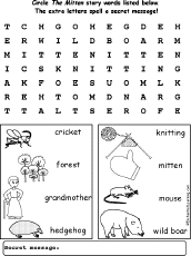 The Mitten Wordsearch Puzzle Find the words in The Mitten wordsearch puzzle, then use the extra letters to find the secret message: "The Mitten is a folk tale." Or go to the answers. |