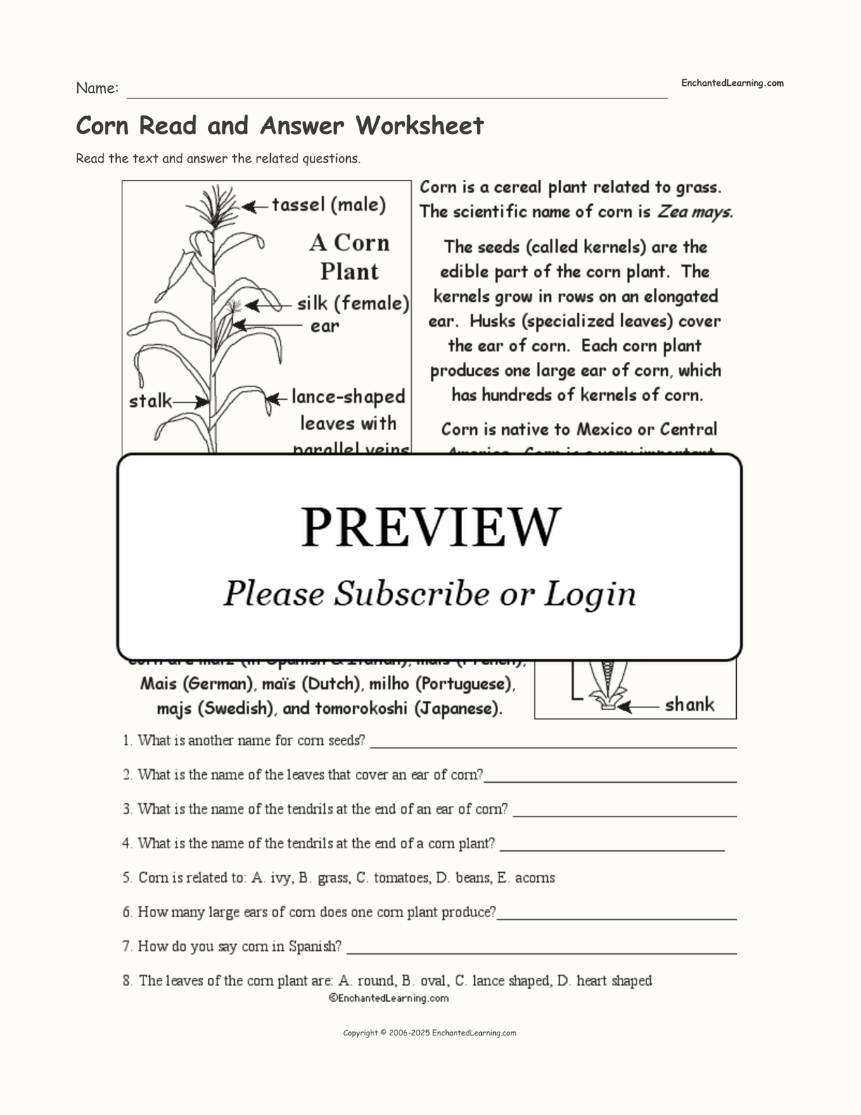 This is a printable worksheet on corn, with text to read, labeled pictures, and questions to answer.