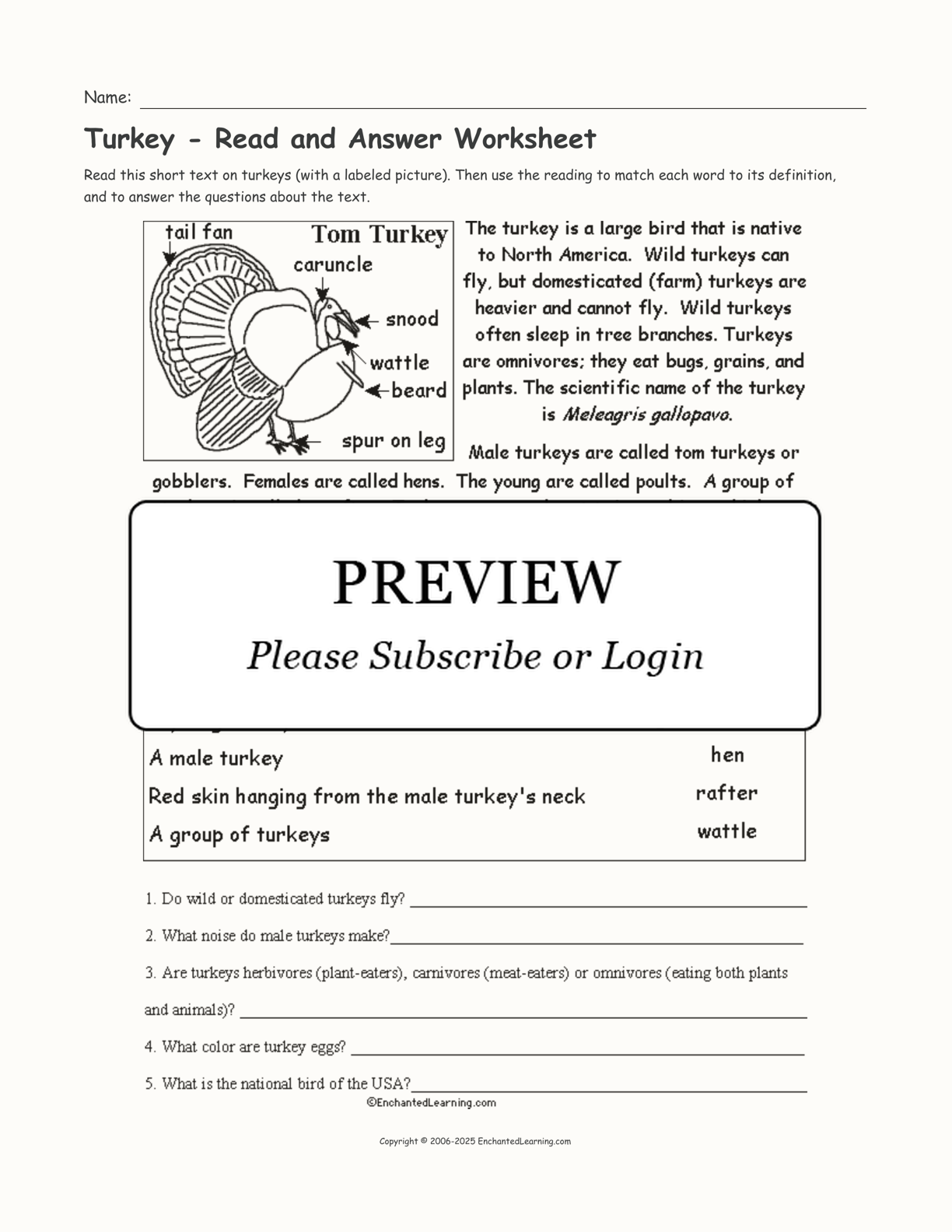 In this printout on turkeys, read a short text with a labeled picture. Then fill out two worksheet parts based on them: turkey-related words to match with their definitions, and fill-in-the-blank short-answer questions.