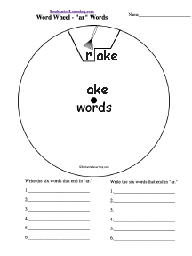 Make Words Wheel -e- This 2-page print-out makes a words wheel; it consists of a base page together with a wheel that spins around. When you spin the wheel, words appear, combining b, g, h, l, m, p, s, and w with eb, ed, eg, em, en, er, et, and ew. Write as many words as you can that are made using the wheel.