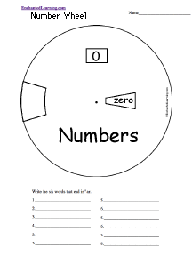 Make a numbers wheel using this 2-page print-out; it consists of a base page together with a wheel that spins around. When you spin the wheel, the numbers 0 through 11 are shown, one at a time, in number form, spelled out, and in pictorial form. The student then writes down the twelve numbers.