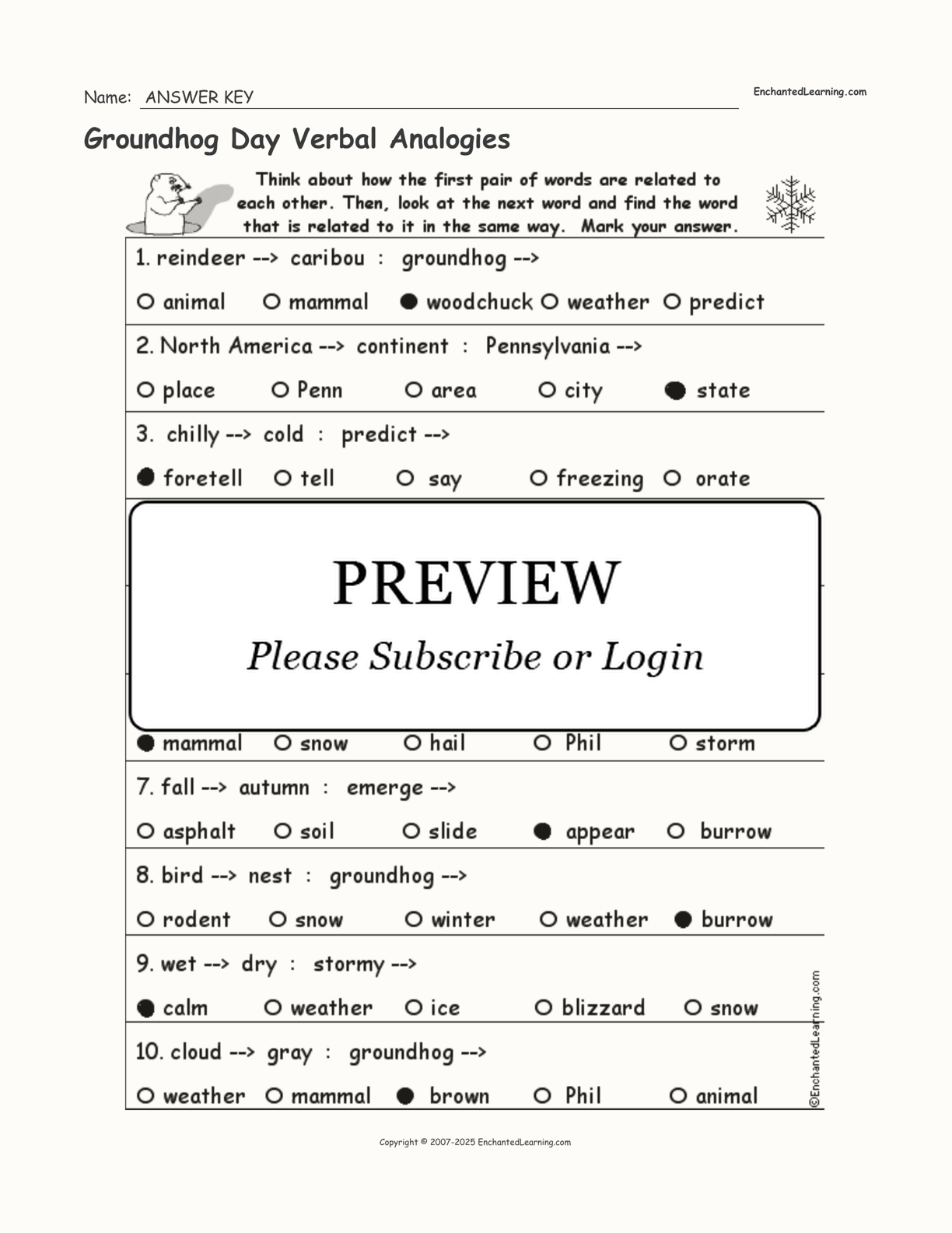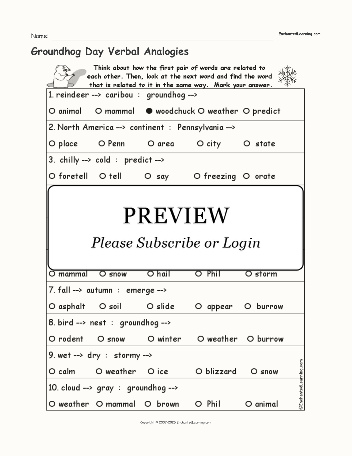Groundhog Day Verbal Analogies. On this printable worksheet, think about how the first pair of words are related to each other. Then, look at the next word and find the word that is related to it in the same way.