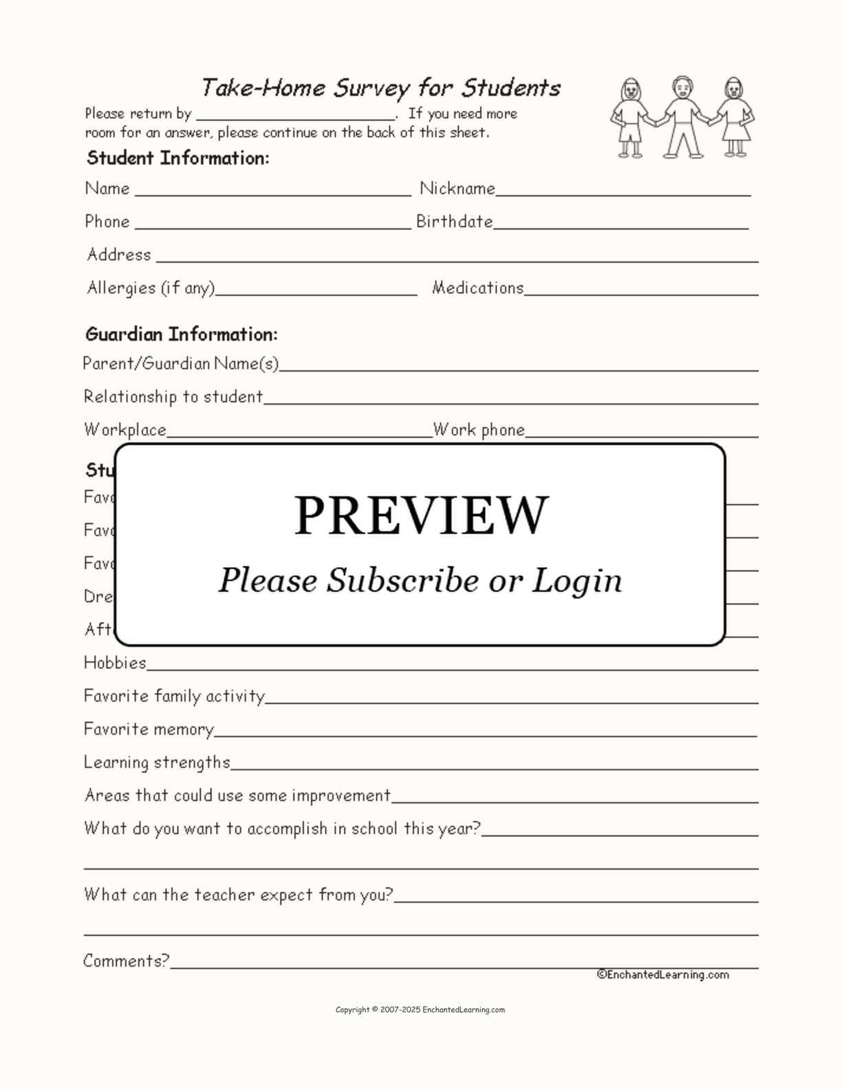 This “Take-Home Student Survey” is a back-to-school printout of student information and preferences.