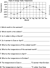 Celsius Line Graph Questions #1: Printable Worksheet A printable activity worksheet in which the student reads a line graph of monthly tundra temperatures in Celsius to answer questions; for example, "Which month is the warmest?" Or go to the answers. Go to a pdf version of the worksheet. |