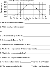 Fahrenheit Line Graph Questions #1: Printable Worksheet A printable activity worksheet in which the student reads a line graph of monthly grassland temperatures in Fahrenheit to answer questions; for example, "Which months are the coldest?" Or go to the answers. Go to a pdf version of the worksheet. |