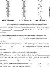 Measure Temperatures #1: Printable Worksheet A printable activity worksheet on measuring temperature using a thermometer (the student needs a thermometer to complete this worksheet). The student measures room temperature, the temperature outdoors, and skin temperature. The student then answers questions about these temperatures. Go to a pdf version of the worksheet. |
