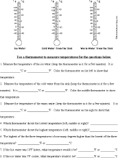 Measure Temperatures #2: Printable Worksheet A printable activity worksheet on measuring temperature using a thermometer (the student needs a thermometer to complete this worksheet). The student measures the temperature of ice water, cold tap water and warm tap water. The student then answers questions about these temperatures. Go to a pdf version of the worksheet. |