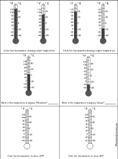 Compare Thermometers #2: Printable Worksheet A printable activity worksheet on temperature and thermometers, with thermometers to color and compare, and questions to answer. Or go to the answers. Go to a pdf version. |