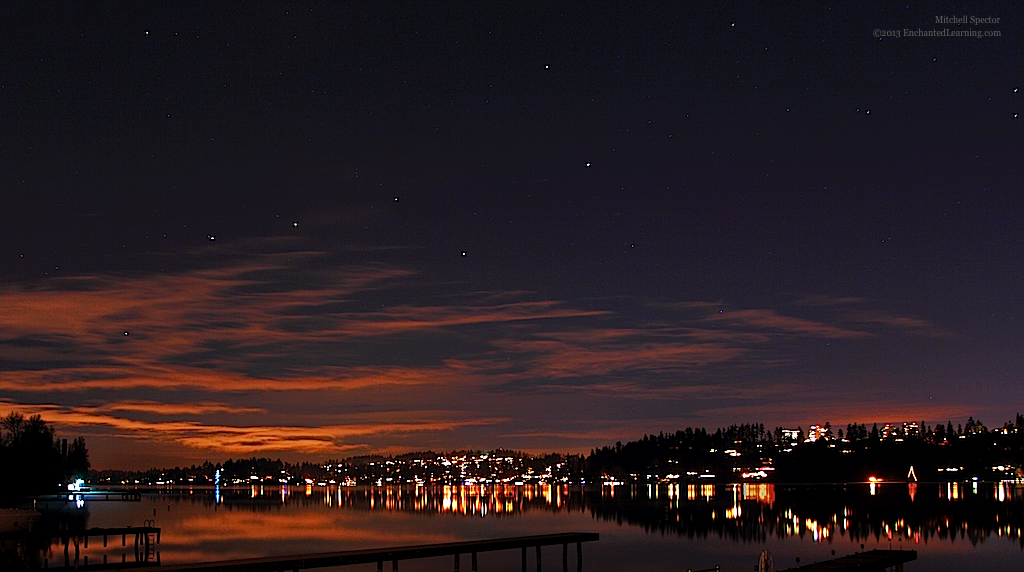 The Pleiades, Moon, Jupiter, Aldebaran, and Venus over Lake Washington