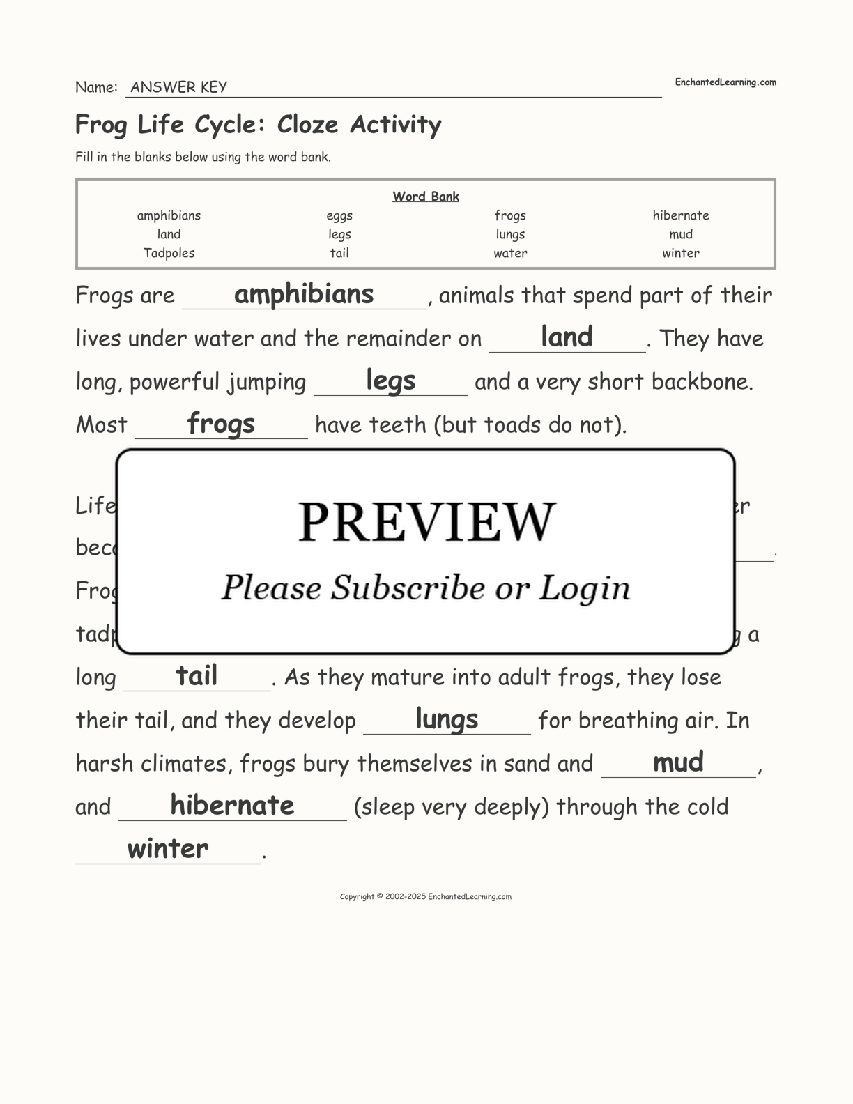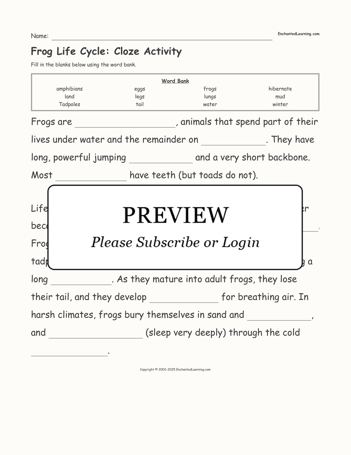 Use the word bank to fill in the blanks in this Frog Life Cycle cloze activity. This is a printable worksheet.