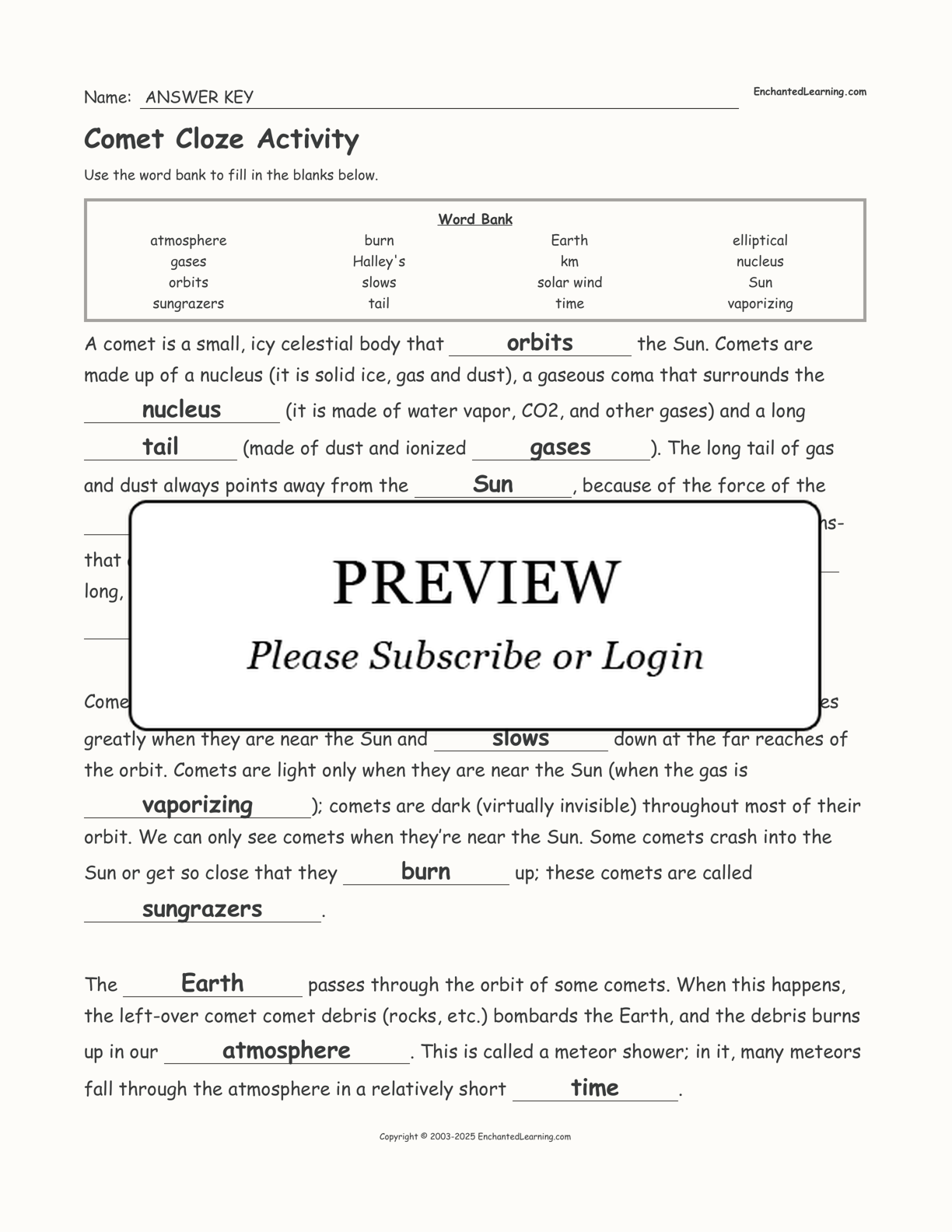 Use the word bank to fill in the blanks in this comet cloze activity. This is a printable worksheet.